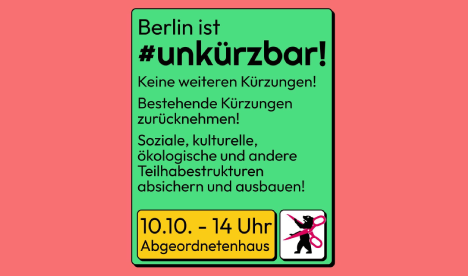 Der Doppelhaushalt 2026/27 sieht Kürzungen in zentralen sozialen, kulturellen und gesellschaftlichen Bereichen vor. Gemeinsam mit dem Bündnis #unkürzbar setzen wir ein Zeichen für den Erhalt von Teilhabe, sozialer Infrastruktur und Zusammenhalt – kommt zur Demo am 10. Oktober!