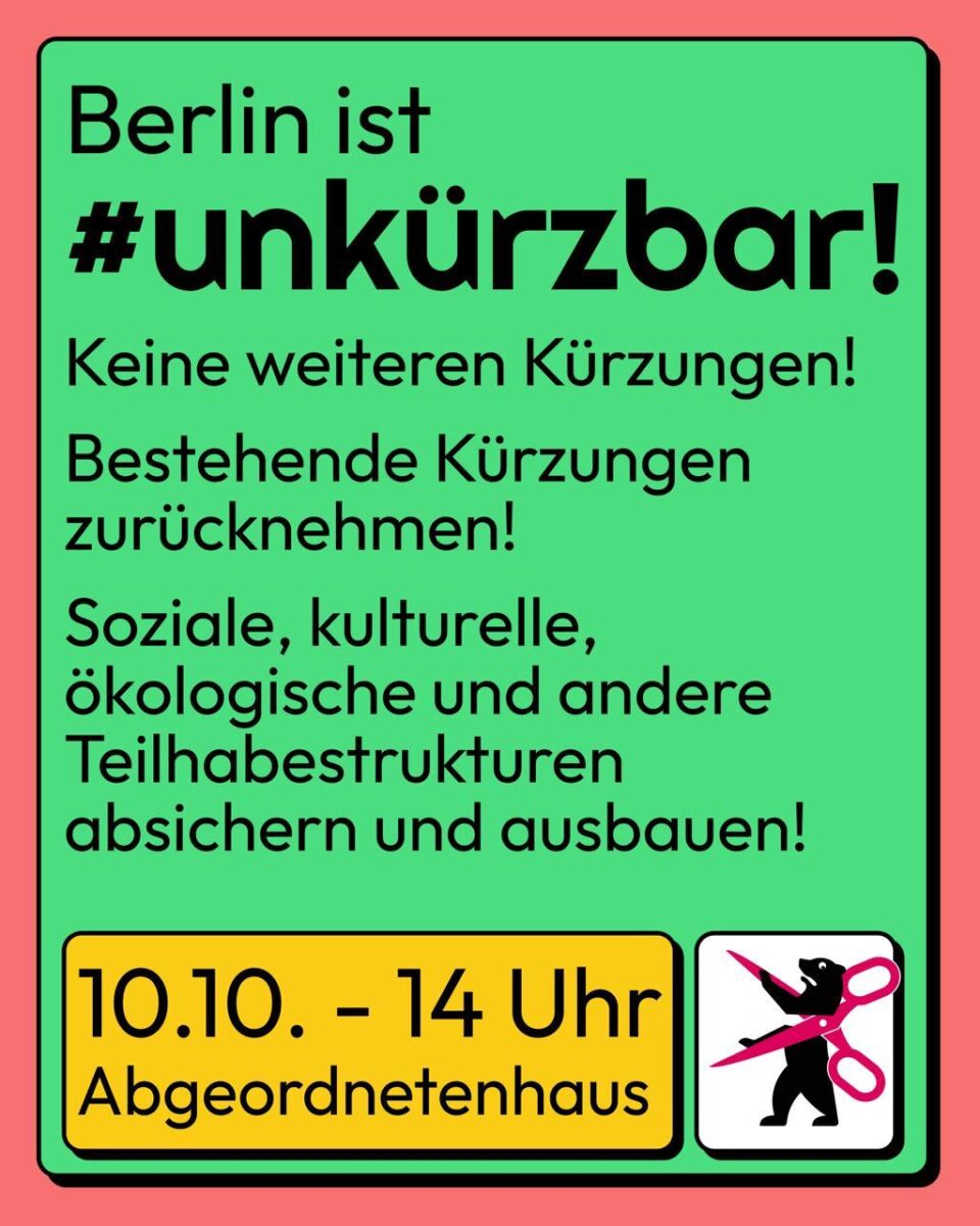 Um auf die Folgen der Kürzungen aufmerksam zu machen, organisiert das Bündnis #unkürzbar am 10. Oktober eine Demonstration. Dabei soll sichtbar gemacht werden, welche Auswirkungen die geplanten und bestehenden Kürzungen auf unterschiedliche Bereiche haben.