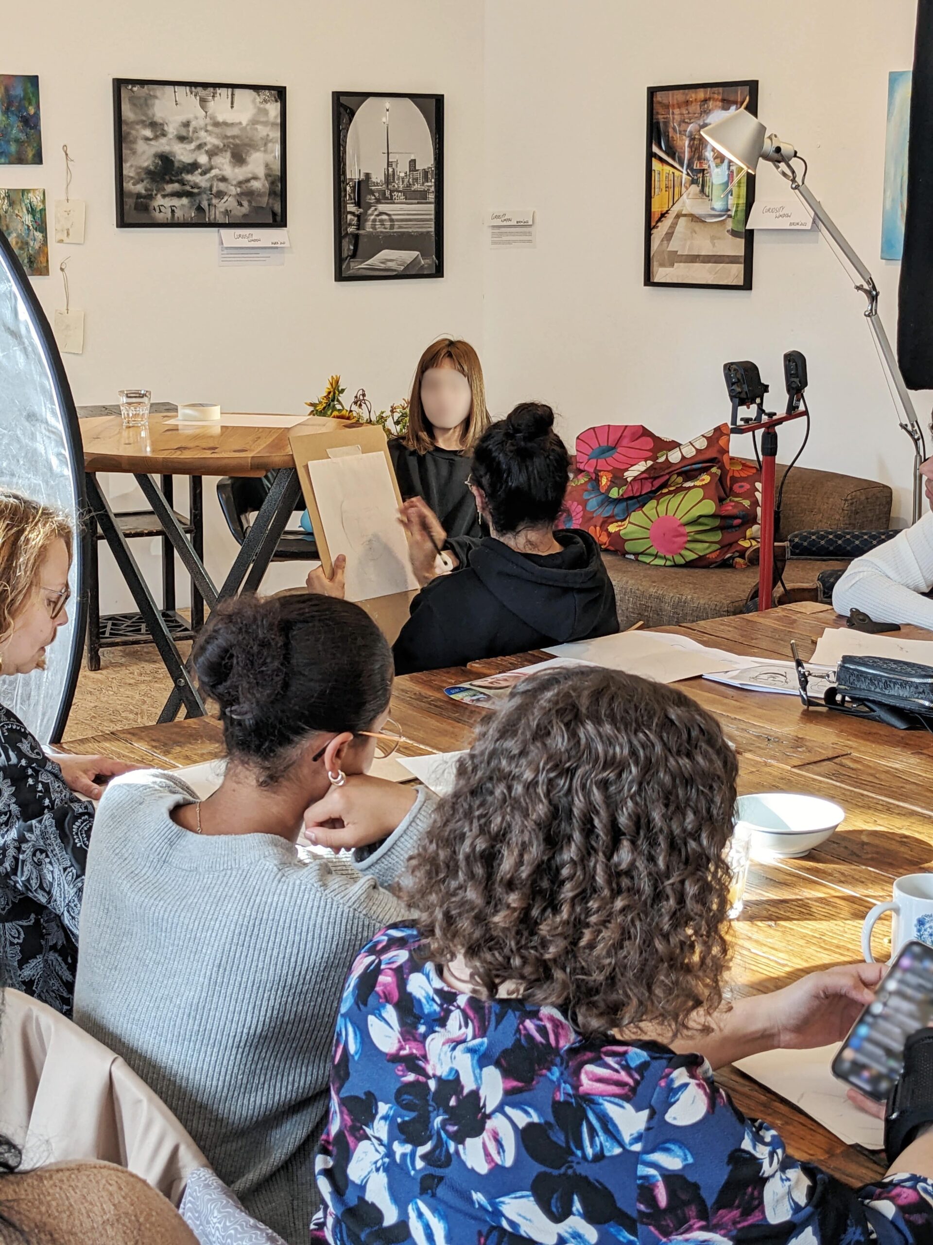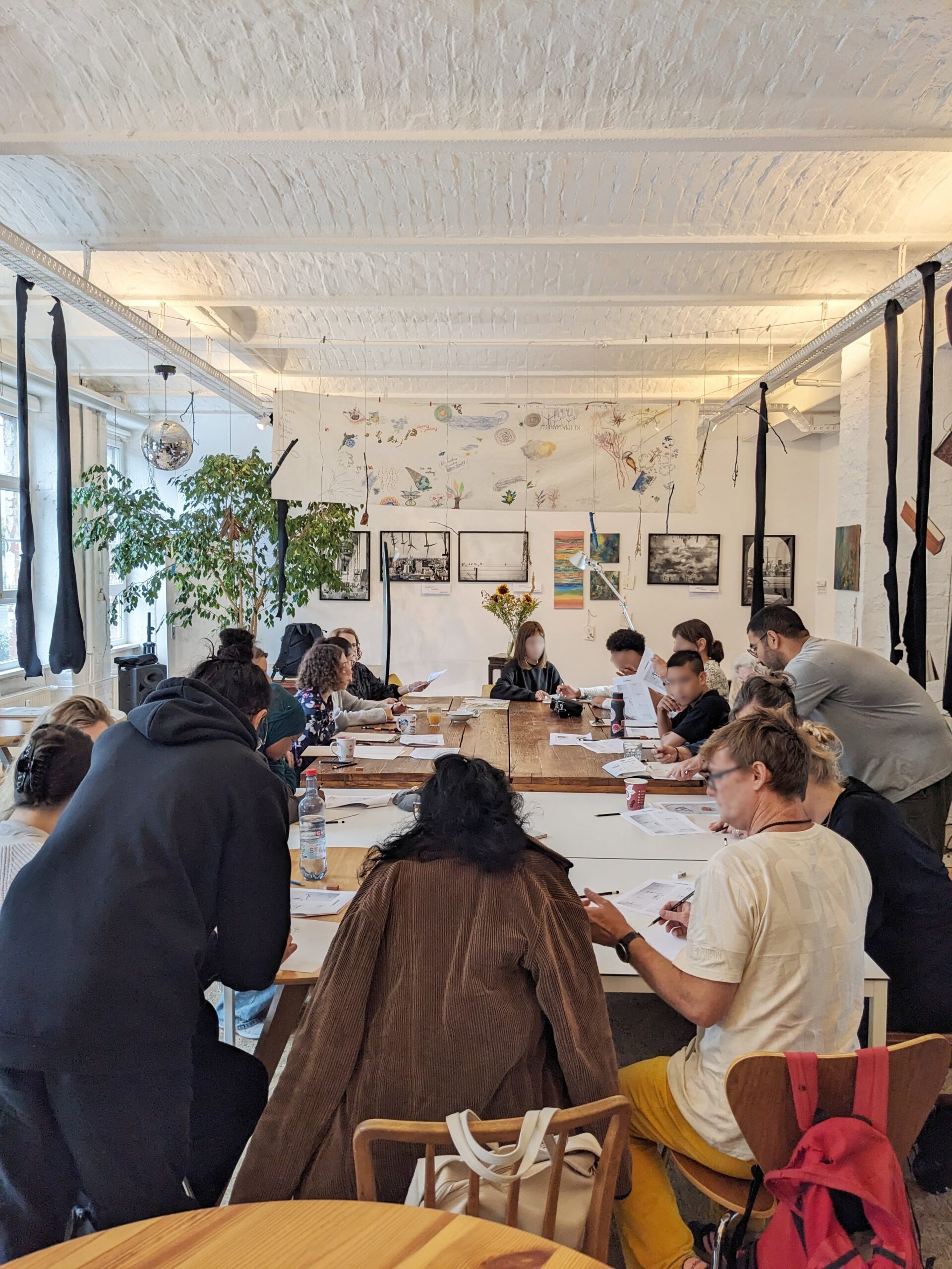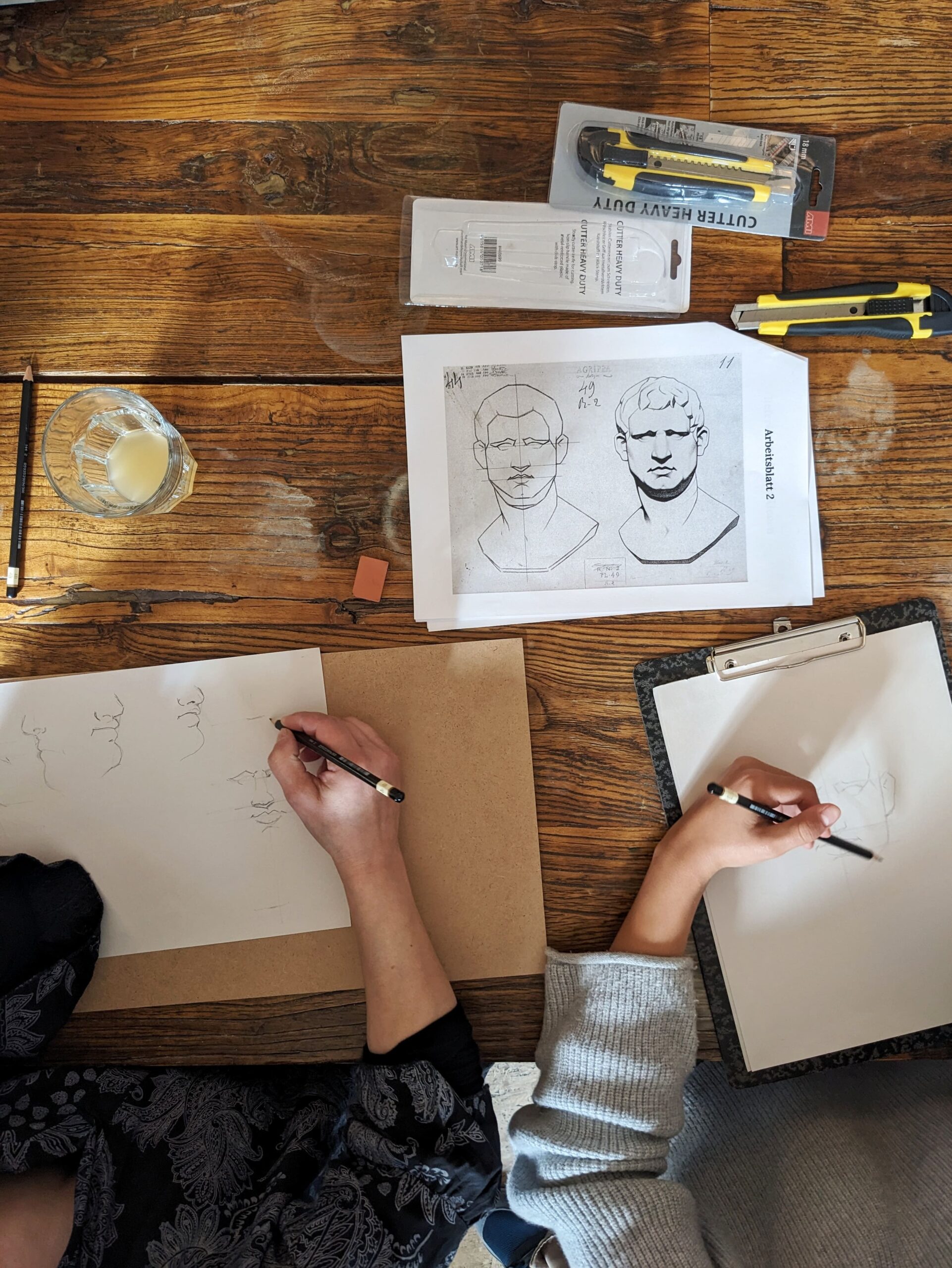 Bei dem Zeichen-Workshop ,,Geschichten durch Porträts erzählen“ kamen knapp 20 Menschen zusammen, um gemeinsam kreativ zu werden. Geleitet von drei erfahrenen Künstler*innen wurden zunächst Grundlagen des Porträts-Zeichens geübt und anschließend anhand eines Live-Models Porträts gezeichnet.